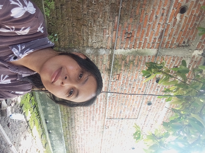 A woman with brown hair and a patterned shirt is in the frame. She is fair-skinned and looking at the camera. Behind her is a brick wall, some plants with green leaves, and a concrete structure. There is also some moss visible. The scene is a mix of natural and constructed elements.