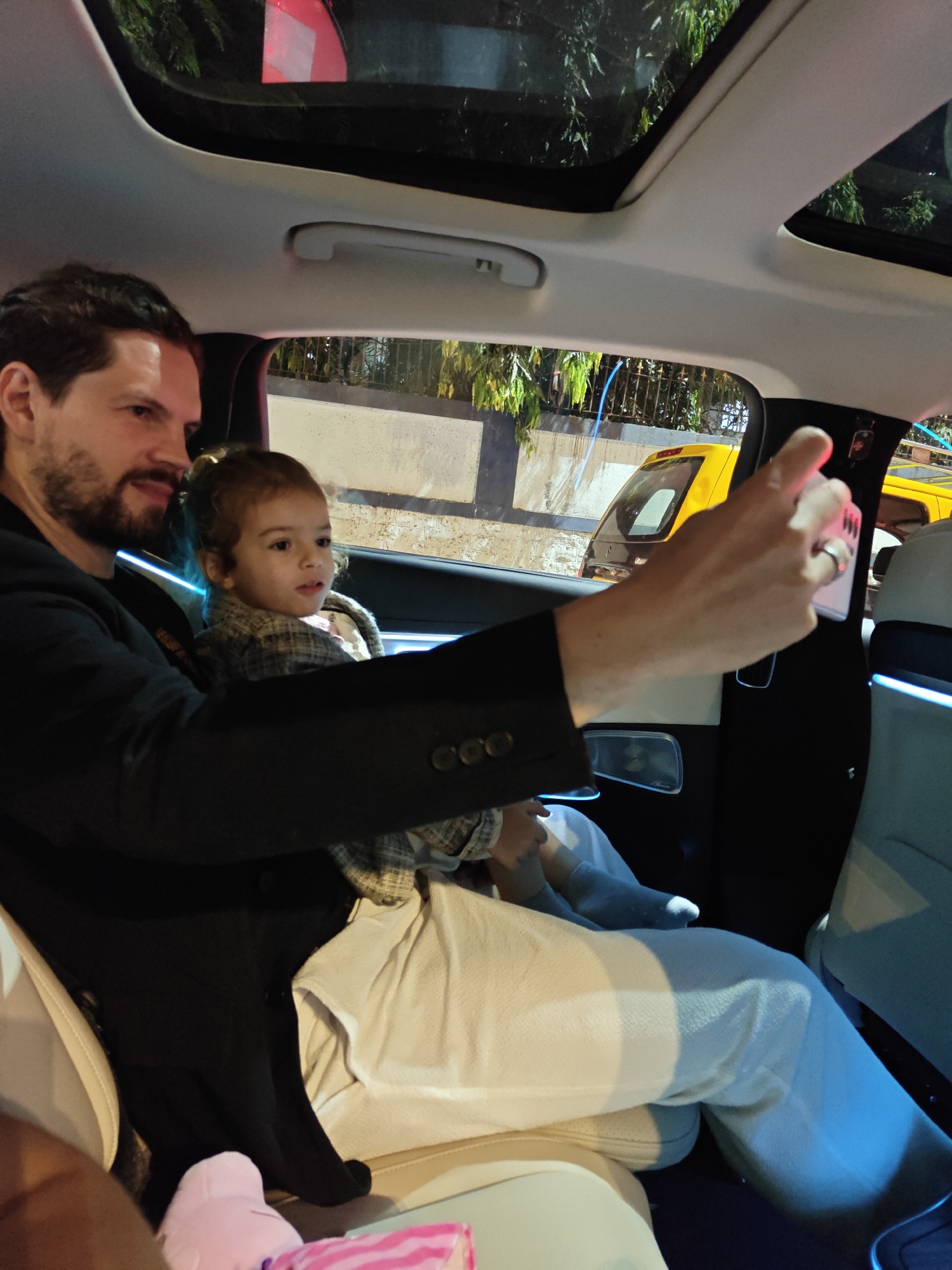 The image depicts the interior of a modern vehicle at night in Mumbai, India. An adult male, estimated to be between 30 and 40 years old, with dark hair and a beard, occupies the rear passenger seat on the left. He is dressed in a dark blazer over a lighter shirt and light-colored trousers. His right arm is extended forward, holding a white smartphone, positioned as if capturing a photograph or video. A silver-colored ring is visible on his left hand. Seated on the male's lap or immediately beside him is a young child, approximately 2-4 years old, with light brown hair styled in a small bun. The child wears a plaid shirt and is looking towards the right side of the vehicle, mouth slightly open. The vehicle's interior features light-colored leather or fabric upholstery, blue ambient lighting along the door panels, and a panoramic sunroof, which reveals dark tree foliage and the night sky. A soft pink object, possibly a toy, is partially visible on the seat in the lower-left foreground. Through the vehicle's windows, several yellow-and-black taxis, characteristic of Mumbai, are visible in the background. Beyond the vehicles, a concrete wall topped with a dark metal fence and dark green trees can be seen under ambient artificial illumination.