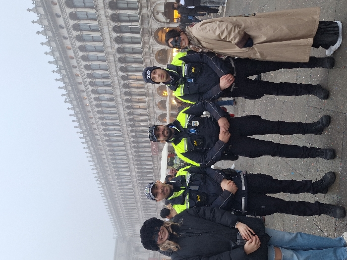 A group of people stand in front of a building with arched windows and a detailed facade. Three people are dressed in dark blue uniforms with bright yellow trim. Two women stand on either side of them. One is wearing a long beige coat and dark sunglasses, and the other is wearing a dark jacket and jeans. The sky is overcast and hazy.