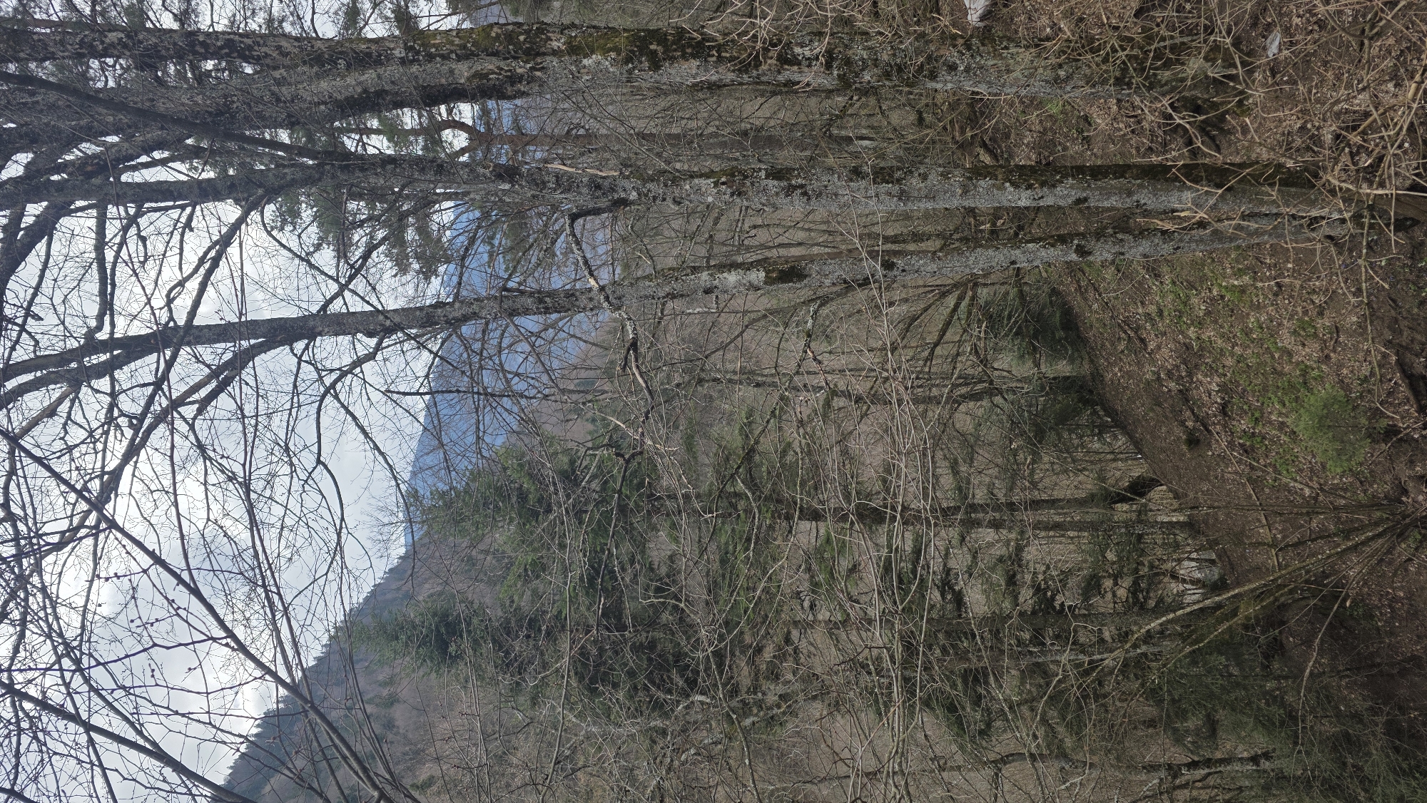 The image depicts a mountainous woodland scene in the vicinity of Rilski manastir, Bulgaria, likely during a transitional season such as late winter or early spring. The foreground and midground are dominated by numerous bare deciduous trees, displaying intricate networks of grey-brown branches and twigs, some with nascent buds. Interspersed among these are several taller, dark green coniferous trees, particularly visible on the left side and further back. The ground slopes downwards from right to left and from the foreground into the mid-distance, covered primarily with dark brown soil and scattered dry leaves, with occasional small patches of green vegetation. In the distant background, a series of hazy blue mountain ranges or peaks are visible, partially obscured by the trees. The sky is largely overcast with lighter grey clouds and some hints of brighter sky. No human subjects, animals, or artificial objects are present within the frame.