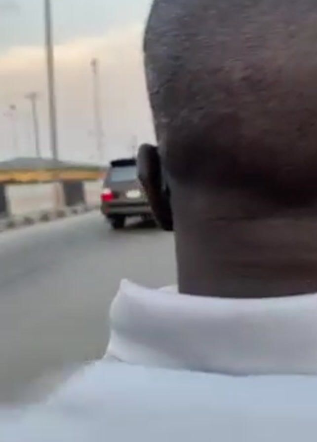 back of a dark-skinned man's head and white collared shirt as he walks on a roadside. In the distance, a dark SUV drives away on a road with a median. The environment suggests an urban area with street lights and a cloudy sky. The video appears to be shot from a low angle, following the man as he moves forward. Wind noise is audible.