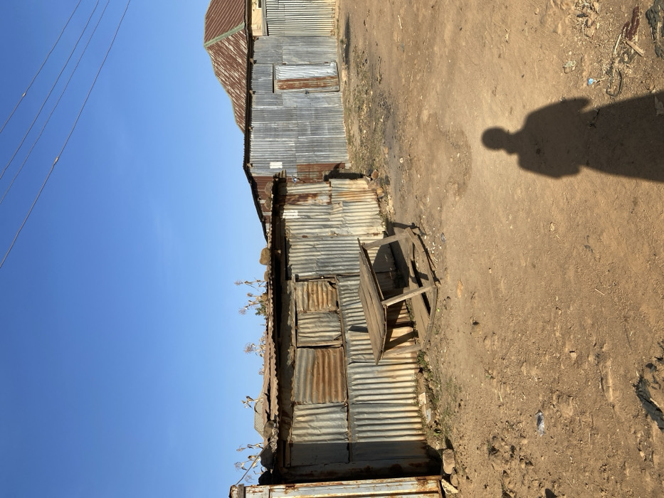 Corrugated metal buildings line a dirt road under a clear blue sky. One building features makeshift window coverings and a simple wooden table sits nearby. A person's shadow is cast on the road, suggesting a sunny day. Overhead power lines are visible against the sky. The overall scene evokes a sense of poverty.