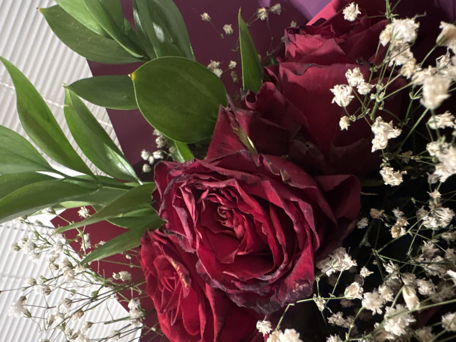 The image captures a close-up view of a floral bouquet. Dominant elements include several dark red roses, some exhibiting darkened or slightly wilted petal edges. These are interspersed with small clusters of white flowers, consistent with baby's breath (Gypsophila), and multiple dark green foliage leaves. The bouquet is wrapped in dark red or burgundy paper. The background features light-colored, horizontal window blinds, indicating an indoor setting. No individuals, actions, or interactions are depicted. The image lacks visual information to specify a precise location within the city of Plovdiv, Bulgaria.