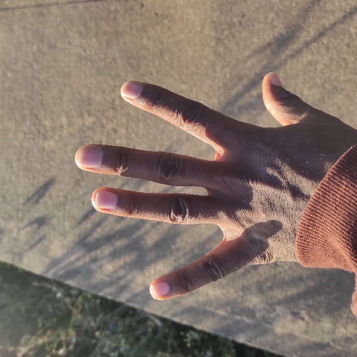 - "A human hand, exhibiting darker skin pigmentation, is centrally positioned and splayed with fingers extended, partially covered by a brown, ribbed fabric sleeve at the wrist" by FM-MUTfh2, licensed under CC BY 4.0