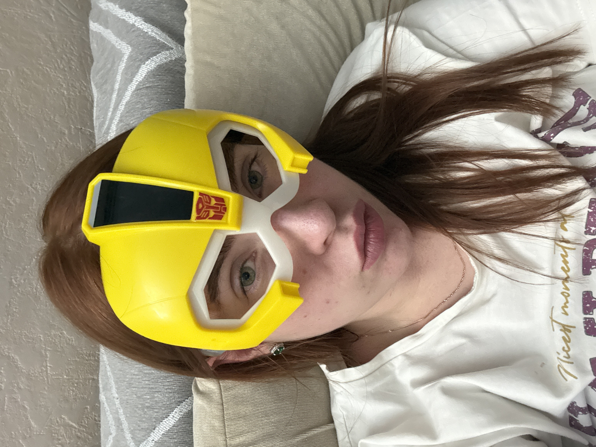 A woman is wearing a yellow Bumblebee Transformer mask and lying on a patterned gray and white surface, presumably a bed or couch