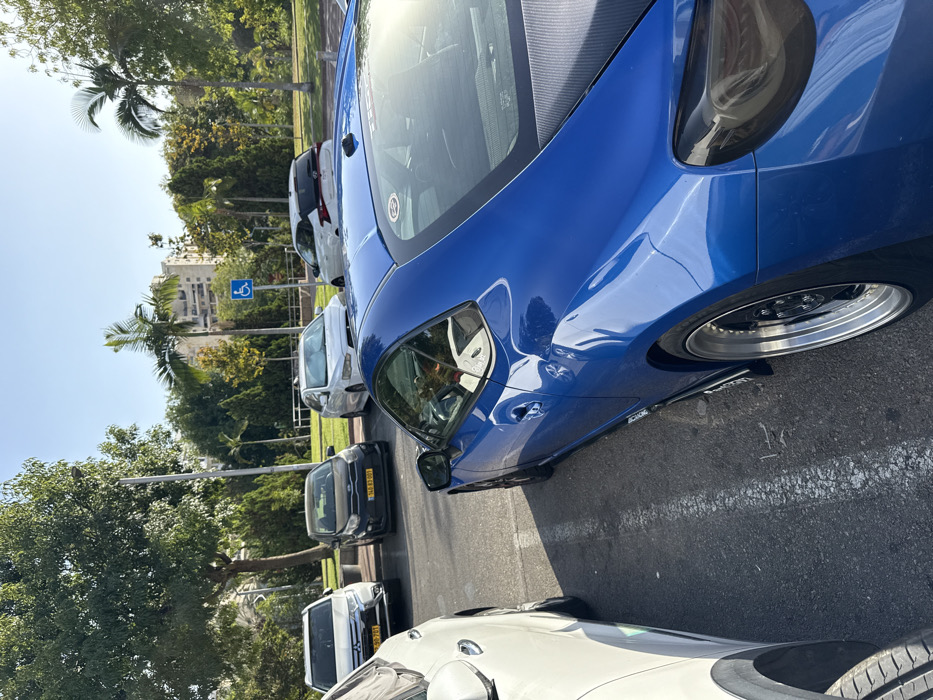 The image displays an outdoor parking area in Holon, Israel, under clear daylight conditions. A blue two-door sports car, possibly a Subaru BRZ or Toyota GT86, dominates the right foreground, angled with its driver's side and rear visible. The vehicle features multi-spoke silver wheels, side skirts with "ADVAN" branding, a carbon fiber rear trunk section, and tinted taillights. A small, light brown canine face is discernible through the driver's side window. To the immediate left of the blue sports car, a white SUV's front left quarter is partially visible. Across a paved parking aisle, three vehicles are parked in a row along a curb: a black Kia Picanto with Israeli license plate "148:83-001," a white Mitsubishi Lancer sedan, and a white Hyundai i20 hatchback. The parking surface is asphalt with faded white demarcation lines. Behind the parked vehicles, a lush green landscape features various trees, including multiple palm trees. A blue sign displaying a white wheelchair symbol indicates designated accessible parking. In the distant background, several multi-story light-colored residential buildings are visible beneath a clear blue sky. No human figures are present in the scene.