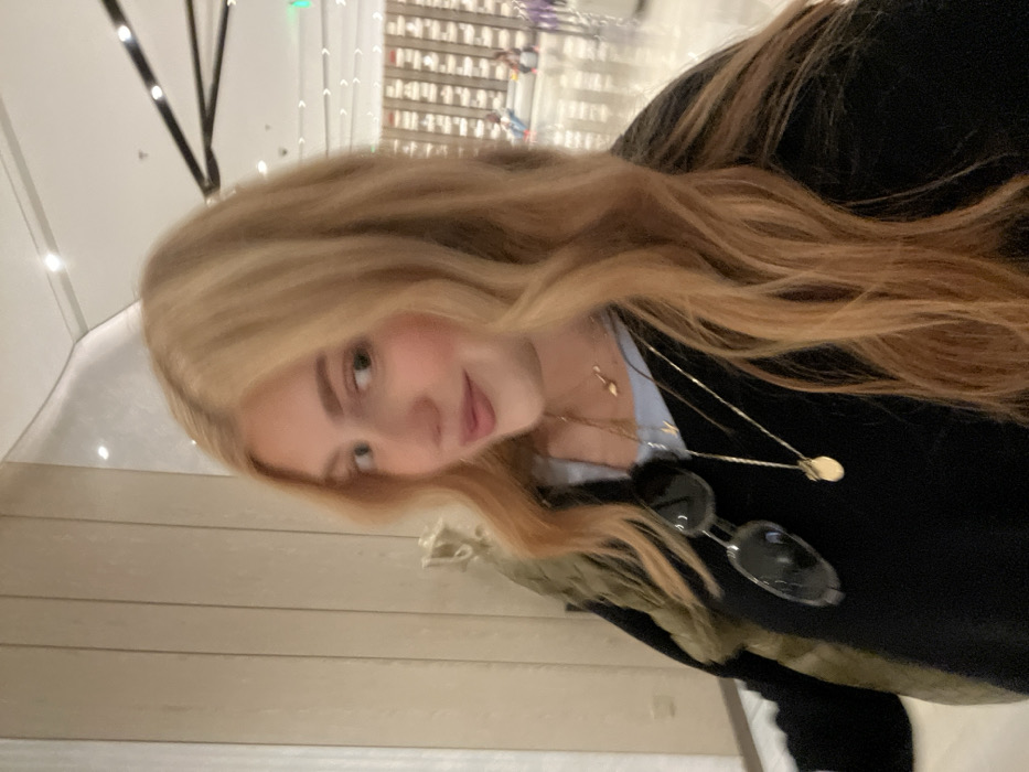 A young woman with blonde hair poses for a selfie. She has fair skin and is wearing multiple gold necklaces. Sunglasses hang from her dark shirt, layered over a light blue top. A green jacket is partially visible. The background includes a brightly lit interior with a light-colored wall and blurred displays of items in the distance.