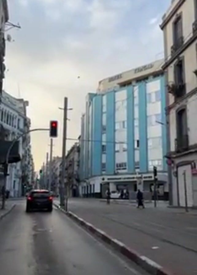 city street on a cloudy day. A car waits at a red light on the left side of the street. In the center of the frame, tram tracks run down the middle of the street. Several pedestrians walk along the sidewalk on the right side of the street near a building called "Hotel Tandja". Buildings line both sides of the street. The street is wet, likely from recent rain. A bird flies across the sky.