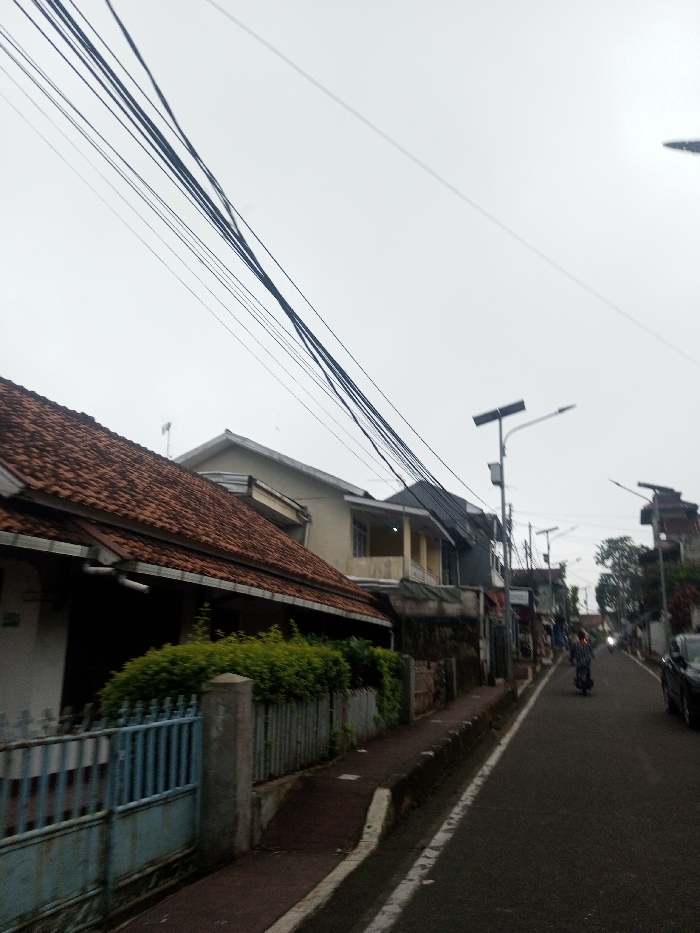 A street scene on an overcast day features houses with tile roofs and a variety of architectural styles. Power lines crisscross the sky above. A narrow sidewalk runs alongside the road, with a fence bordering a yard filled with greenery. A motorcycle and a car are visible on the street, suggesting light traffic. Streetlights are placed along the road, contributing to the urban setting.