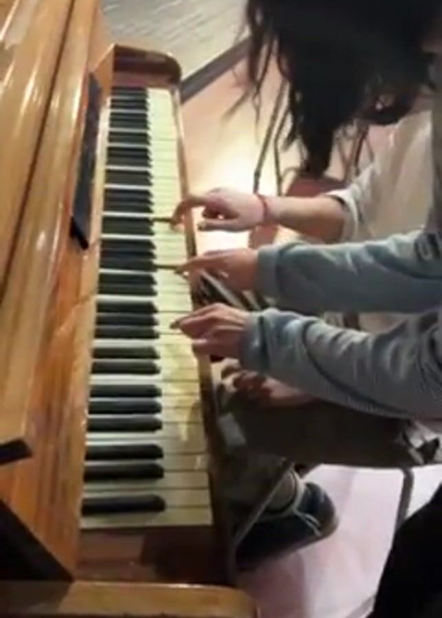 Two people are playing a piano together in what appears to be a backstage area