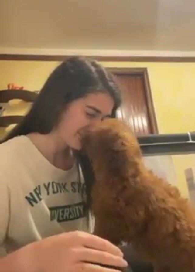 A young woman with long, dark hair, wearing a light-colored "NEW YORK STATE UNIVERSITY" t-shirt, sits on the floor, seemingly interacting with a small, brown, fluffy puppy. The puppy is standing on its hind legs, reaching up to the woman's face. The woman is smiling and appears to be gently stroking and kissing the puppy. The scene takes place indoors, with a yellow wall in the background and a partially visible object that looks like a pet pen or crate. There is also a wooden door in the background. The lighting in the room is warm, and the camera appears to be hand-held or resting on a surface.