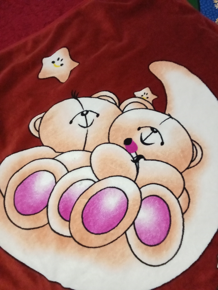 A dark red, textured fabric, consistent with a blanket, is depicted in Ciputri, Indonesia. The fabric features an illustration of two light brown cartoon teddy bears embracing. The bear positioned on the left has a smiling expression with closed eyes and eyelashes. The bear on the right has closed eyes and a pink object in its mouth. Both bears exhibit pink inner ear details and pink paw pads. A white crescent moon shape is partially visible behind the bears to the right. Two small, light brown cartoon stars with smiling faces are present in the background, one above the left bear and a smaller one near the right bear's head.