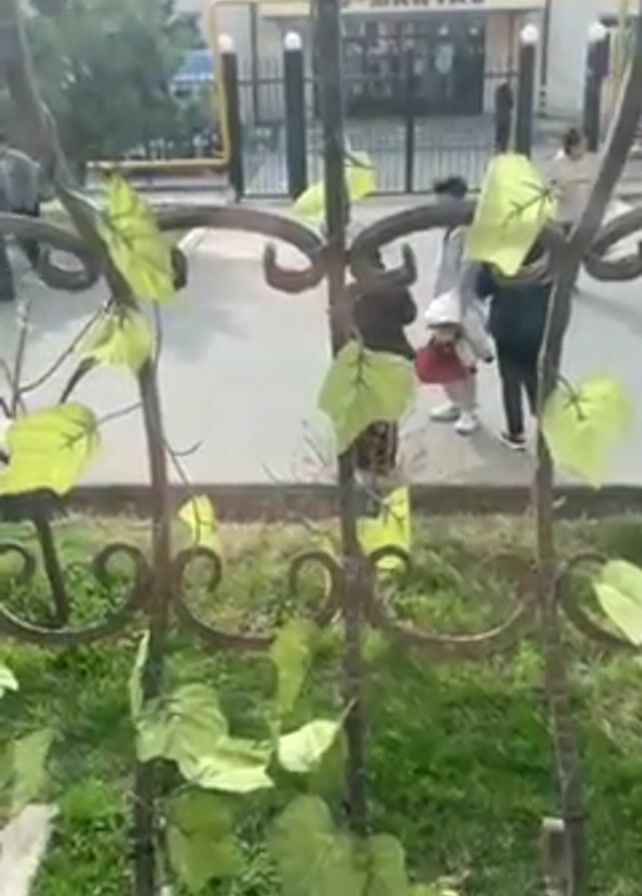 Through a wrought-iron fence with decorative fake ivy, a paved area leads to a building with the word "MAKTAB" on it. People are walking on the pavement. One person is wearing a red dress and white hat. A patch of grass is visible on the ground in front of the fence.