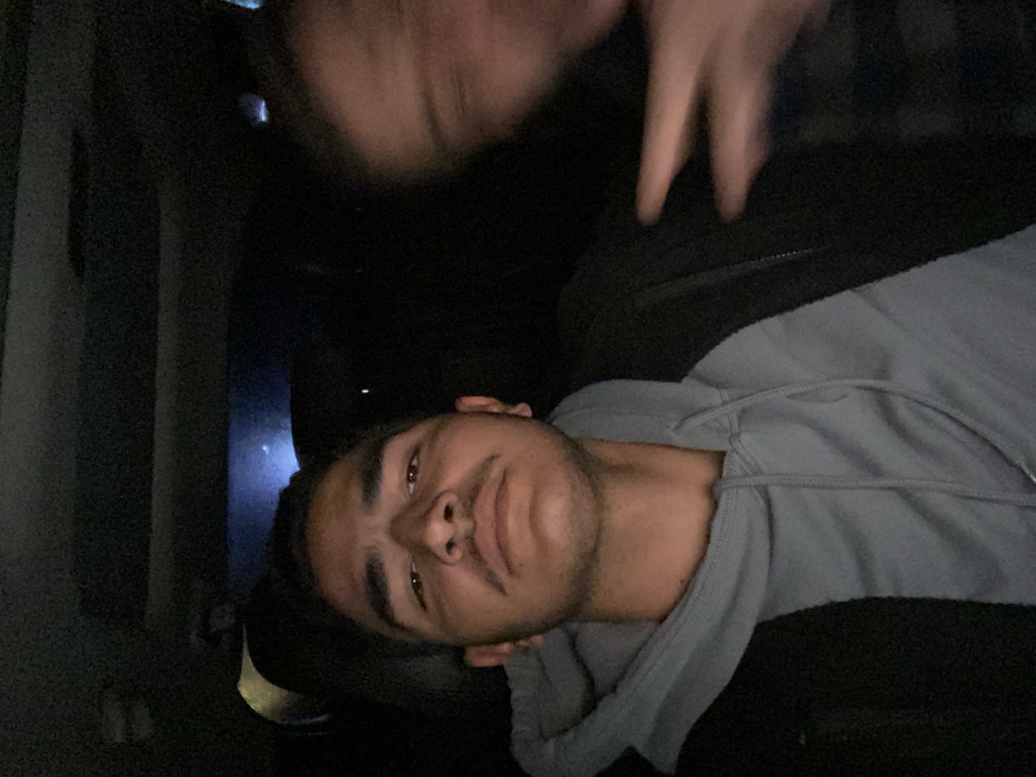 A young man with brown hair and a mustache is lying down wearing a gray hoodie. The image is dark, possibly taken at night, and lit from the left. Another person is partially visible, out of focus, in the top of the frame. They are making a hand gesture. The setting appears to be inside a vehicle, given the interior components on the left side.