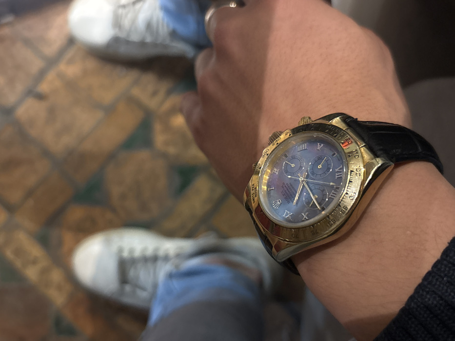 The image, captured in Dkhissa, Morocco, presents a first-person, downward-angled view primarily focused on a person's left wrist. A gold-toned Rolex Daytona chronograph wristwatch is prominently displayed on the wrist. The watch features a dark, possibly iridescent, dial with Roman numeral hour markers and three subdials. The bezel includes a tachymetric scale marked "UNITS PER HOUR." A black leather strap secures the watch. The wearer's left forearm is partially visible, with a dark knitted cuff at the wrist. In the blurred background, a tiled floor is visible, comprising rectangular and square tiles in patterns of brown, beige, and green. Additionally, the lower legs and feet of an individual are present in the background, clad in light blue trousers and white lace-up sneakers. A faint gold-colored ring is visible on a finger of a partially obscured right hand in the mid-ground.