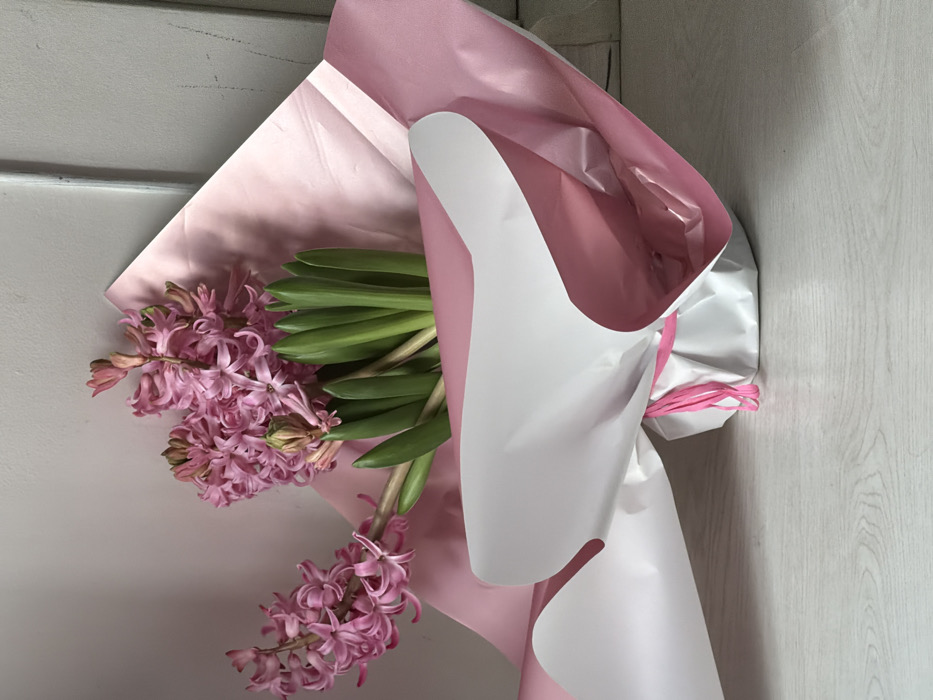 The image displays a potted plant, specifically pink hyacinths, arranged for presentation
