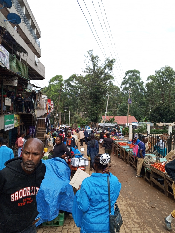 This image depicts a bustling outdoor market street in Kisii Central ward, Kenya, under an overcast sky