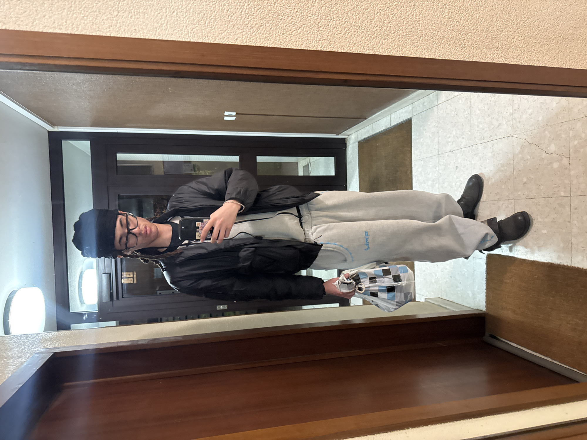 An individual is depicted in a full-length mirror selfie within an indoor hallway or foyer, likely in Les Ulis, France. The subject, a young person with dark dreadlocks, rectangular eyeglasses, and a dark beanie, faces directly towards the mirror, holding a dark-colored smartphone with a multi-colored case in their right hand to capture the image. White earbuds are visible in both ears. They wear a black puffer jacket over a light-colored garment, light grey sweatpants featuring light blue text on the left thigh, and dark shoes resembling slip-ons or loafers. In their left hand, they hold a transparent plastic bag containing items, marked with a black and light blue checkered pattern. The immediate environment features a light-colored, possibly terrazzo, tiled floor with a visible crack extending from the bottom right to the center of the frame. A brown doormat is positioned on the floor near the reflected doorway. The walls are light-colored and textured on the right, and a dark wooden door frame runs vertically along the right edge of the mirror. In the reflection behind the subject, a dark brown door with multiple rectangular glass panels is visible, suggesting an entrance or access point to another area. A circular, white, flush-mounted ceiling light fixture illuminates the scene. Two small white hooks or clips are affixed to the wall to the right of the reflected door. A plain brown wooden door is partially visible on the far left of the frame.
