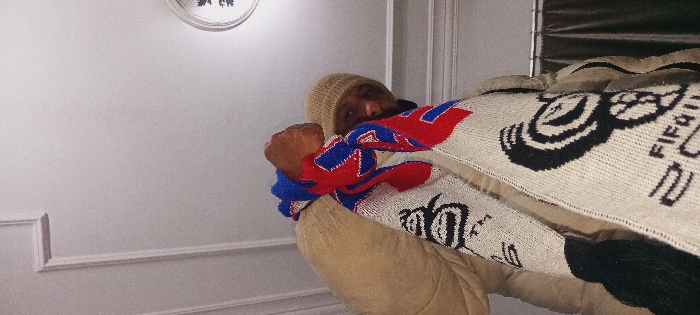 A person in a tan beanie, tan jacket, and a red and blue scarf is shown at a low angle. They are holding a white blanket with black text that looks like “FIFA” and cartoon art. A decorative element can be seen on the wall above the individual. A silver roll-up door is slightly visible in the background.