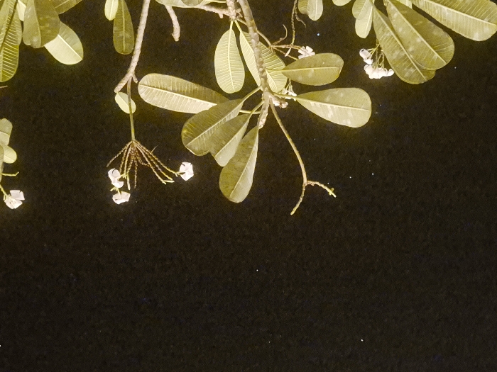 The image depicts a plant branch against a dark background in Tambon Ko Tao, Thailand. The branch, positioned diagonally from the upper right to the lower right, bears multiple ovate, yellowish-green leaves with prominent venation. Several clusters of small, white, five-petaled flowers are visible on the branch. The plant is brightly illuminated, casting a warm hue and creating a stark contrast against the uniform, deep black background. Sparse, faint white particulate matter is visible scattered across the dark area. No individuals or dynamic actions are depicted within the scene.