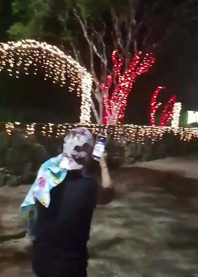 A person wearing black shorts and a black tank top is taking photos with a smartphone in a park decorated with Christmas lights. The person is wearing a white patterned mask covering their head, and a blue patterned towel is draped over their left shoulder. Other people are walking in the park, which is lit by string lights adorning trees and archways. The ground is covered in gravel.
