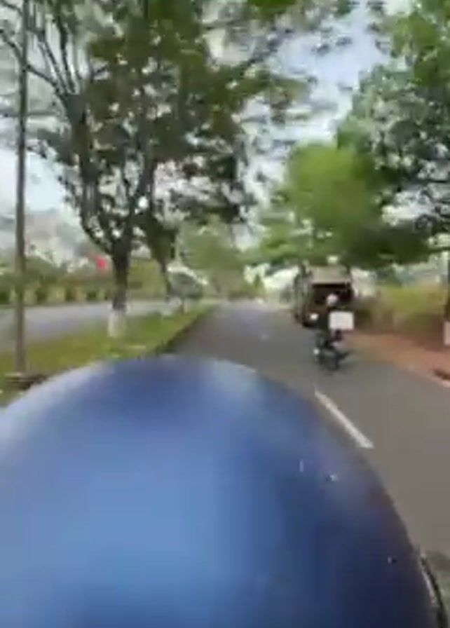 The video, shot from a low angle, shows a road with trees and a cloudy sky. The main focus is a blue helmet, likely worn by the person filming. A white line divides the road, and to the right, there's a green grassy area. A motorbike, appearing to carry a load, moves ahead on the right side of the road. Further down, structures suggesting buildings appear on the right. The camera shakes slightly, indicating the person is likely moving.