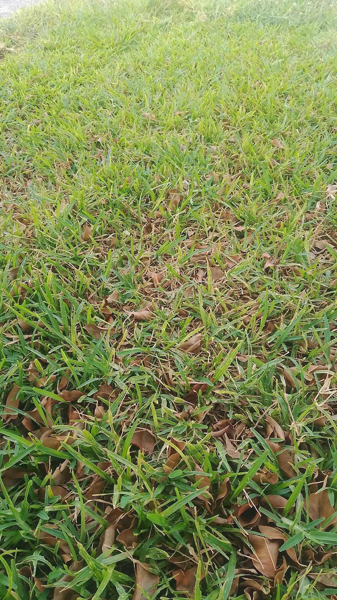 close-up view of a patch of green grass with scattered brown leaves