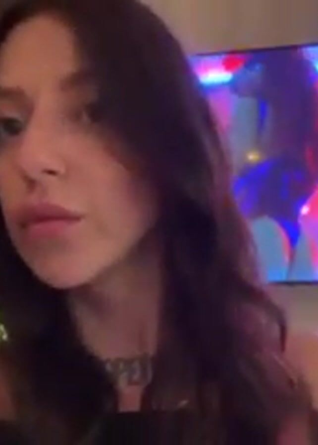 A woman with long brown hair, wearing an off-the-shoulder black top, looks at the camera, purses her lips, smiles, and then looks to her right. She has tattoos on her neck and shoulder. Behind her is a television screen displaying a video with neon lights and a person dancing. In the background, there's a glimpse of what appears to be an outdoor area with plants.