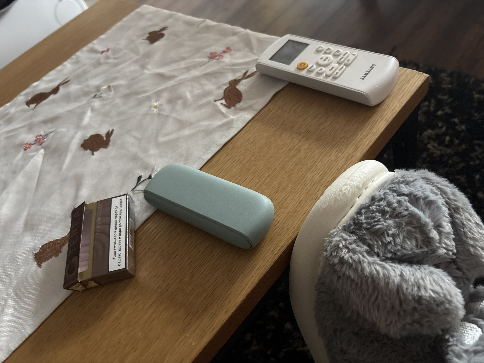 An overhead view depicts a collection of items arranged on a light wood-grain surface, partially covered by a white fabric runner. The fabric features embroidered brown bird silhouettes and small pink and white floral patterns. Prominently displayed on the wood surface, near the fabric, is a brown and pink carton of "TEREA IQOS ILUMA" heated tobacco sticks. The carton bears a Bulgarian health warning: "Това тютюнево изделие уврежда Вашето здраве и води до пристрастяване." Adjacent to the tobacco sticks is a light teal, oval-shaped electronic device. To the right, a white Samsung remote control with a grey display and white and orange buttons rests on the wood surface. In the lower left corner, a grey, fluffy slipper with a white sole is partially visible, positioned on a dark, patterned carpet that extends beneath the wood surface. The scene is set indoors; no specific city location such as Pernik, Bulgaria is identifiable from the visible elements. No people are present.