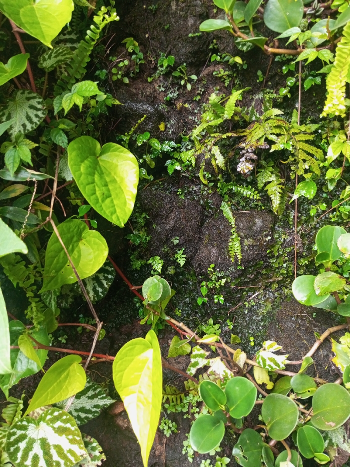 The image displays a close-up, vertical view of a densely vegetated, moist surface in Khammam, India. The scene is dominated by various green plant species growing directly on a dark, irregular, and visibly damp substrate, which appears to be either a natural rock face or an aged, moss-covered concrete wall. **Subjects and Objects:** Multiple plant types are present. Prominently featured are vines with broad, heart-shaped leaves, some exhibiting a vibrant lime-green hue, while others display lighter green or yellowish variegation. Several varieties of ferns are visible, characterized by their intricate fronds and varying shades of green, from delicate light green to darker, richer tones. Numerous smaller, round-leafed plants and other unidentified greenery form a dense undergrowth across the surface. The underlying substrate is dark, rough-textured, and appears wet, with areas reflecting light, indicating a sheen of moisture. There are no people, animals, or artificial objects present in the scene. **Actions and Interactions:** The plants are actively growing and adhering to the vertical, moist surface. There are no dynamic actions or interactions occurring; the scene is static, depicting natural growth and environmental conditions. **Environment:** The environment is characterized by lush, vigorous plant growth on a damp, organic-rich surface. The moisture visible on the substrate and foliage suggests a humid, possibly shaded, and well-hydrated setting, consistent with tropical or subtropical conditions.