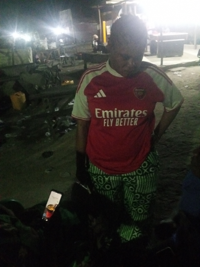 In a nighttime setting, an individual wears a red and white Arsenal soccer jersey, paired with green patterned pants. They are standing with one hand on their hip. To the left, a smartphone lies on a dark surface, displaying a beverage image. The background reveals a cluttered outdoor area with indistinct structures and scattered items, illuminated by bright overhead lighting.