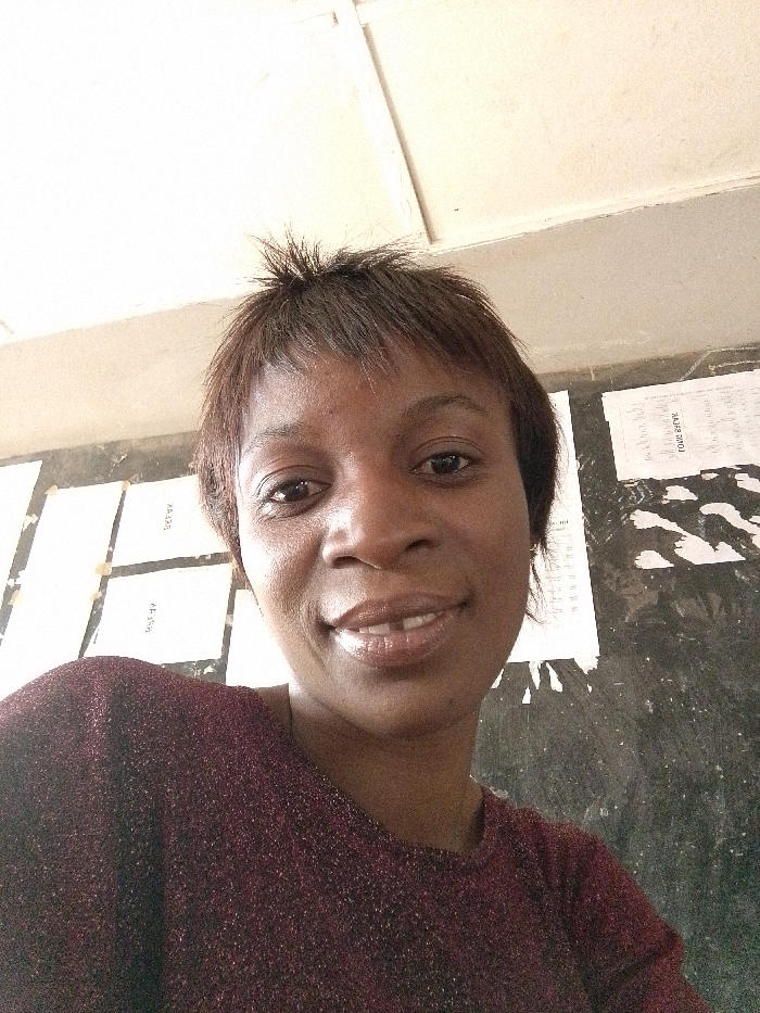 An adult female subject, with dark skin and short dark hair, is depicted from the chest up in a well-lit indoor environment within Barnawa, Nigeria