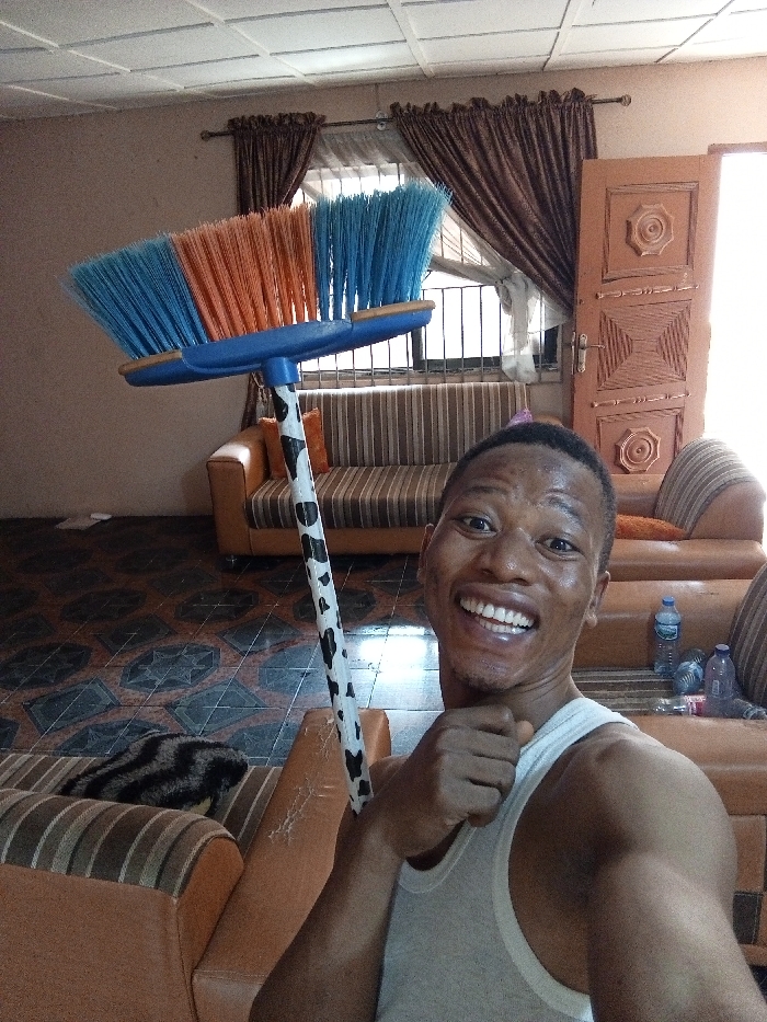 The image displays a selfie taken by a male individual within a residential interior. The man, appearing to be an adult with dark skin and short dark hair, is in the foreground, smiling broadly with visible teeth, and wearing a white sleeveless undershirt. His right hand is clenched into a fist. Directly behind him and to his left stands a broom with a blue plastic head featuring distinct sections of blue and orange bristles. The broom handle is white with irregular black spots, resembling a cow print. The background shows a living area. A tan sofa with horizontally striped seat cushions (light brown and beige) is centrally positioned. An orange throw pillow rests on this sofa. To the left, a window fitted with metal security bars is visible, framed by drawn brown patterned curtains. To the right, an open light brown wooden door with embossed circular and square patterns allows bright external light into the room. The walls are light brown, and the ceiling consists of white square panels. The floor is tiled with a repeating dark and light geometric pattern. On the armrest of a tan sofa to the man's right, two plastic water bottles and one other clear plastic bottle are visible. A section of a foreground sofa armrest, showing signs of wear with exposed lighter material, is also present to the man's left. The location is an unknown residential interior in Unknown, Unknown.
