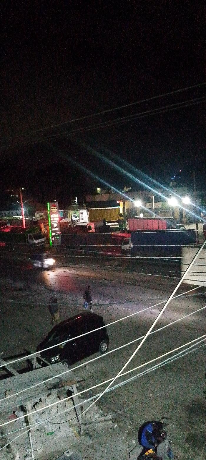 The image depicts an elevated night view of a street and commercial area in Frere Town ward, Kenya. The scene is illuminated by artificial light sources, creating prominent lens flares and visible digital noise. In the immediate foreground, multiple white utility lines run diagonally across the frame, partially obscuring a paved or dirt surface. A dark-colored compact SUV or hatchback is parked or slowly moving on the right, with its rear section visible. Below and to the left of the vehicle, an unfinished concrete block structure is present. In the bottom right corner, a person is partially visible, wearing a dark top and a blue and black helmet or backpack. The midground features a paved road where a vehicle with bright headlights is captured in motion, producing a light streak from left to right. Two male pedestrians are on the road surface: one is visible to the left of the moving vehicle's light, facing generally right; the other is to the right, holding a light-colored object (possibly a bucket) and facing generally left. Behind the road, a line of heavy vehicles is parked, including multiple semi-trailers loaded with red and dark blue shipping containers. The background reveals a commercial complex featuring illuminated buildings and signs. A tall, vertical, green-lit sign, possibly for a petrol station, stands prominently on the left side of the background. Additional vans and trucks are visible around the buildings. The sky is dark and heavily affected by visual noise.