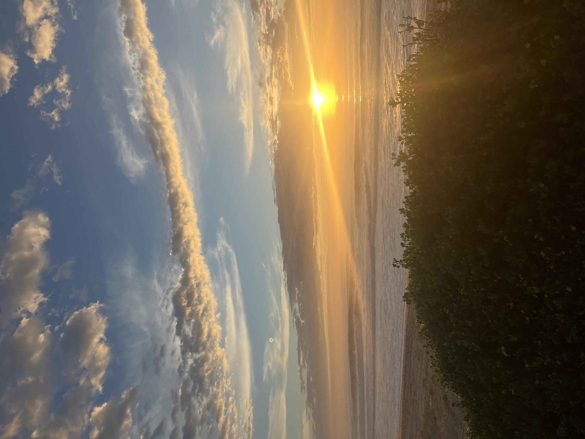 This vertical photograph captures a coastal sunrise or sunset scene in Wollongong, Australia, viewed from an elevated perspective looking towards the ocean. The upper two-thirds of the image depict a sky with a gradient from pale blue at the top to a luminous golden-orange hue near the horizon. Various cloud formations are present: scattered cumulus clouds in the upper left, illuminated by golden light; a prominent, elongated horizontal band of golden-tinged clouds stretching across the mid-sky; and subtle wispy cirrus clouds. A green lens flare is visible in the upper-mid left quadrant of the sky. The sun, a brilliant yellow-orange orb, is positioned low on the horizon, slightly to the right of center, emitting strong, radiant light rays that extend across the sky and create an intense, reflective golden path on the ocean's surface. The ocean exhibits multiple lines of breaking waves with white foam, with the water appearing in a blend of dark blue-grey and golden tones. A narrow strip of light brown sand is visible along the coastline in the lower-left portion of the image. The foreground, comprising approximately the lower one-third of the frame, is dominated by a dense mass of dark green shrubbery, characterized by broad leaves and scattered small yellow flowers. Portions of this foliage on the right side are directly illuminated by the low sun. No human figures, animals, or man-made structures are discernible within the frame.