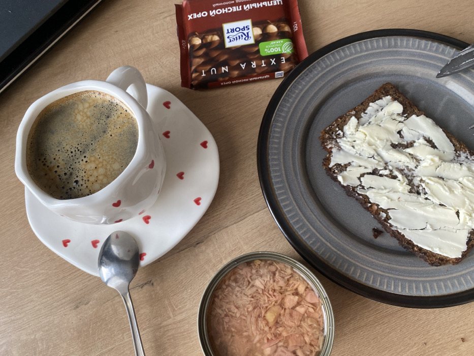 A cup of black coffee sits on a white saucer adorned with red hearts, next to a silver spoon. Nearby is a partially eaten bar of Ritter Sport chocolate with hazelnuts and the words "EXTRA NUT" are displayed on the wrapper. A plate features a slice of dark bread generously topped with white spread, beside a can of tuna. All items are arranged on a light brown wooden surface, possibly a table.