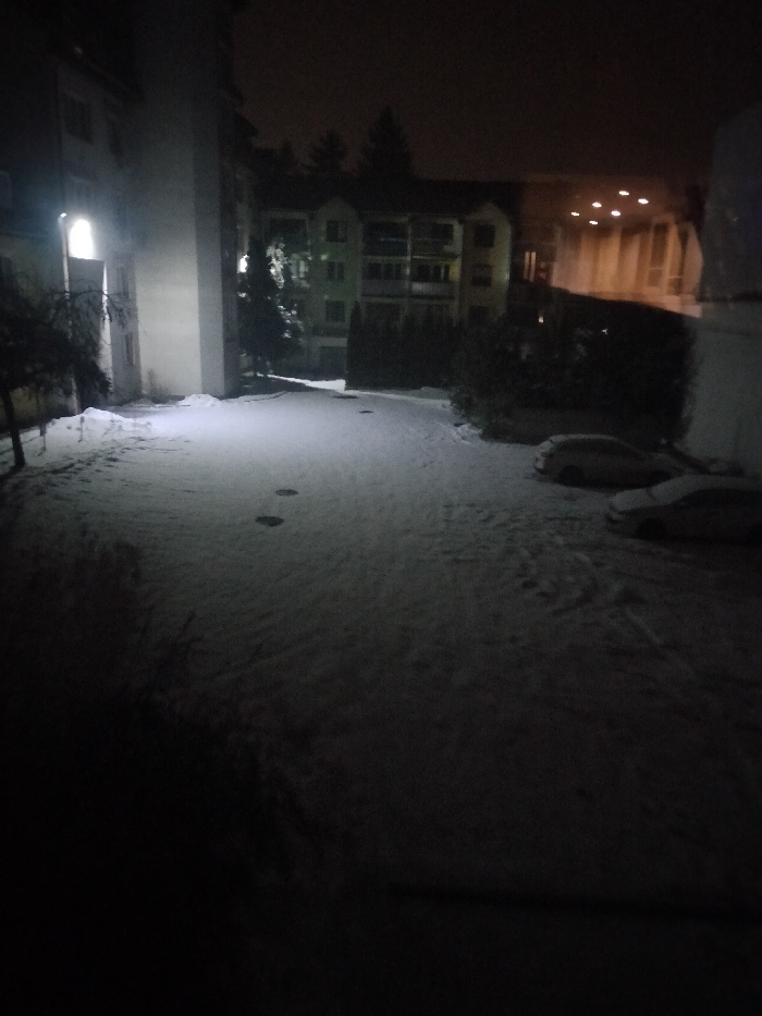 A night scene depicts a snow-covered yard, illuminated by a light source on the left building. Footprints are visible in the snow. Further back, a multi-story building is discernible with lit windows. Two cars are parked on the right side of the yard. Bushes and trees are scattered around the area. The foreground is shrouded in darkness.