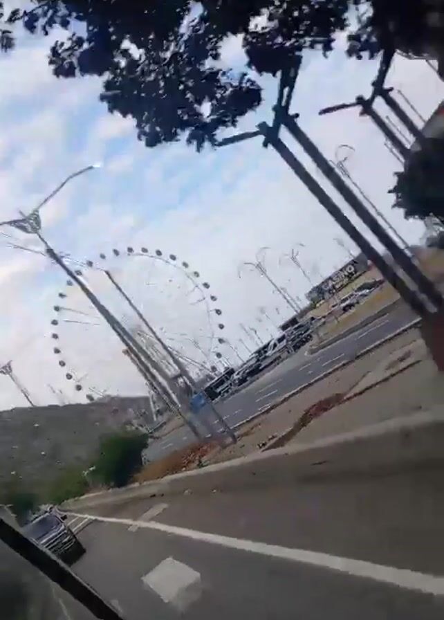 view from inside a moving vehicle looking out the window. The vehicle is driving on a paved road with a double yellow line. Outside the window, there's a Ferris wheel, lampposts, a road with a few cars, trees, and a colorful wall. The sky is partly cloudy.