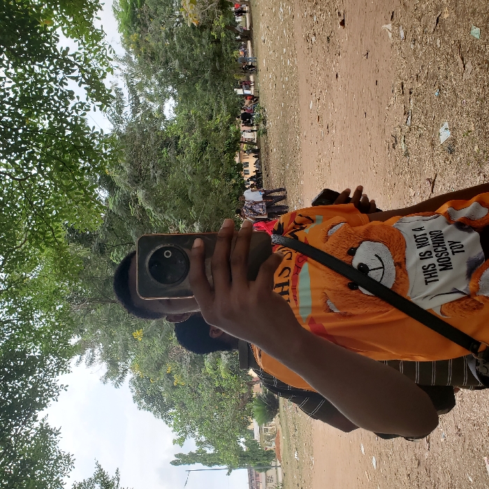 A person wearing an orange Moschino teddy bear shirt holds a smartphone, likely taking a photo or video. The individual is outdoors, amidst green trees and a clear sky. A crowd of people is visible in the background, standing near a building. The ground appears to be a dirt or sandy surface. The person's focus seems directed towards capturing the scene in the background with their phone.