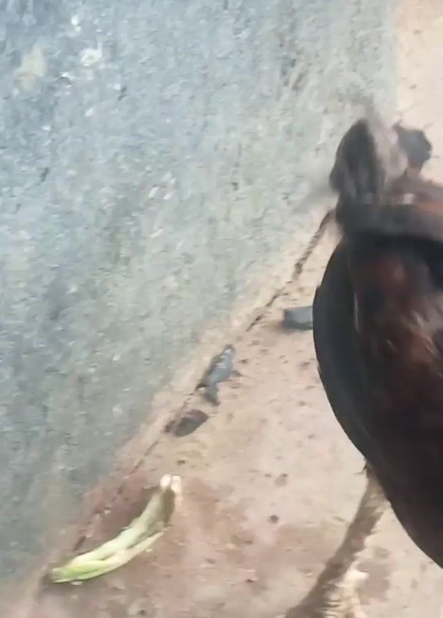dead chicken lying on the ground. The chicken is brown and black with pale legs and a red comb. The ground is dirt and some pieces of cardboard and other debris are scattered nearby. The camera angle is from above the chicken.
