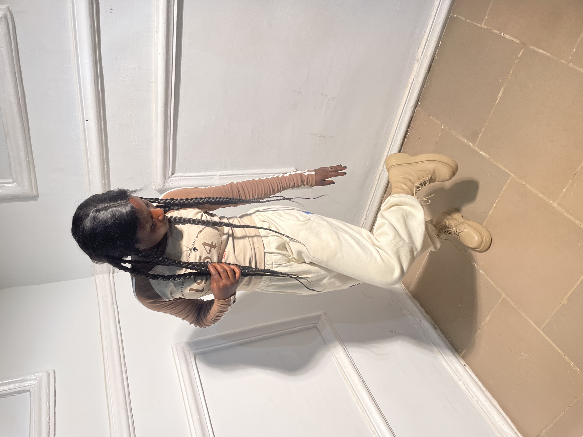 An individual is depicted standing in the corner of a room in Barakin Akawo, Nigeria. The subject possesses dark skin and long, dark braided hair. They are dressed in a two-toned, long-sleeved shirt featuring a light beige torso with "1994" and additional text, and light brown sleeves detailed with two white stripes. Cream-colored sweatpants and light beige platform boots complete the attire. A dark pendant hangs from a necklace on their neck, and a ring is visible on their left ring finger. The individual is positioned with their right knee bent, the right foot resting on its tip, while the left foot remains flat. Their gaze is directed downwards, and their right hand grips a section of their braided hair. The immediate environment includes white-painted walls adorned with two levels of decorative white molding. The floor is covered with light brown square tiles. Illumination originates from an unseen source above and to the left, casting a shadow of the individual onto the adjacent wall.