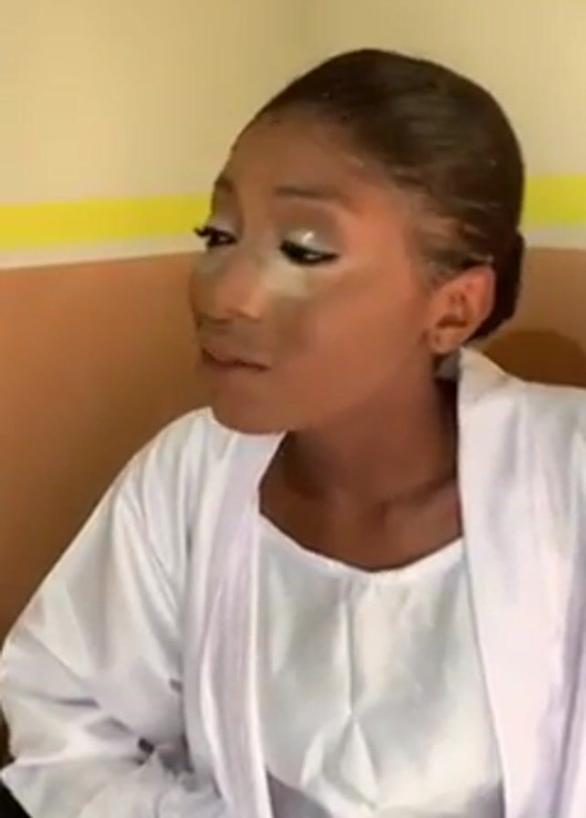 A young woman with brown hair pulled back into a bun is sitting and speaking. She is wearing a white robe over a white top. Her face has heavy white makeup around her eyes and on the bridge of her nose. She is looking slightly off to the left of the camera. The background is a wall with a tan lower section and a yellow stripe at the top. There are other items out of focus to the left of the woman.
