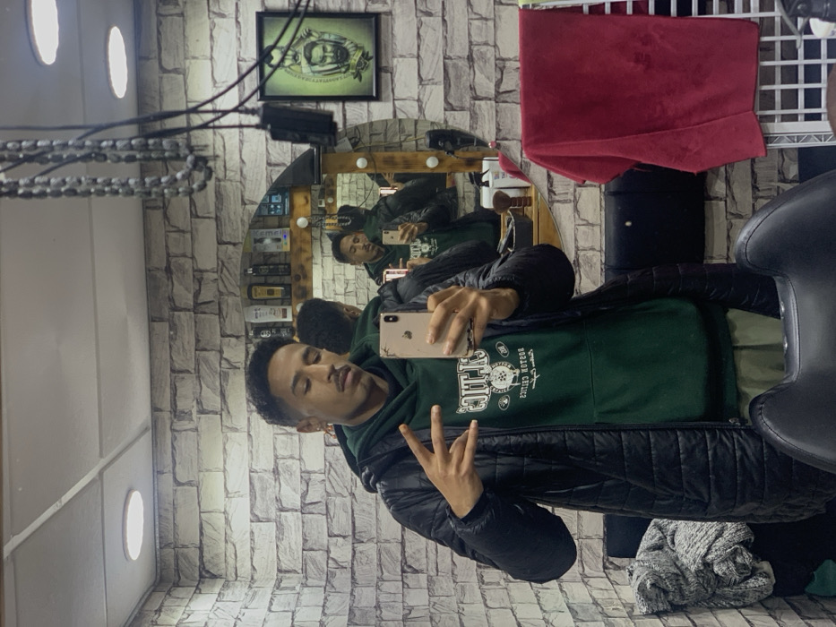 A person with short hair, wearing a dark jacket and a green hoodie, takes a selfie in a barber shop