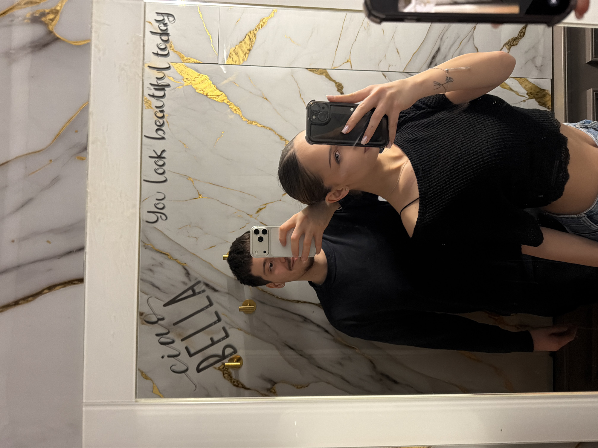 An indoor scene in Sofia, Bulgaria, depicts two individuals taking a mirror selfie. The primary subject is a large, white-framed rectangular mirror reflecting the two people and the wall behind them. The wall features white marble tiles with prominent gold veining. Scripted text is applied to the mirror: "ciao BELLA" on the left and "You look beautiful today" on the right. Two golden wall hooks are visible on the marble behind the mirror. On the left, an adult male with short dark hair and a dark long-sleeved top is reflected. He holds a light-colored smartphone with a clear case, partially obscuring his face from the nose down. His expression appears to be a slight smile. He wears a small earring in his visible left ear. On the right, an adult female with dark hair pulled back is reflected. She wears a black, off-the-shoulder, short-sleeved textured top with a lace trim, showing a portion of her midriff, and light-colored jeans. She holds a dark-colored smartphone with a clear case, largely obscuring her face from the nose down. A thin silver necklace is visible. On her left forearm, a small, dark, stylized tattoo and a delicate bracelet with a silver tassel are present. Her fingernails are manicured with a light polish. Both individuals are engaged in the act of capturing their reflection.