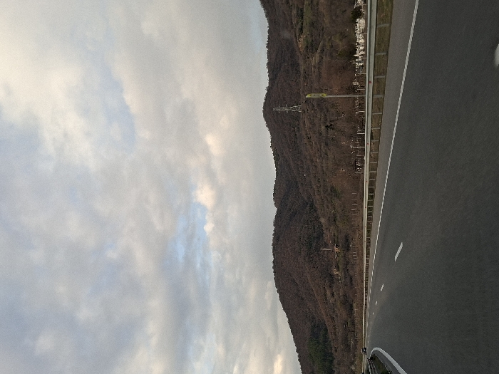 The image displays a multi-lane asphalt highway located in Simitli, Bulgaria, viewed from a forward-moving perspective. The road surface is dark grey, featuring white dashed lines delineating lanes and a solid white line on the left shoulder. A silver metal guardrail runs parallel to the right side of the highway. Beyond the guardrail, a cemetery containing numerous light-colored headstones is visible, interspersed among bare trees and brown vegetation. A tall metal lattice tower, potentially an electricity pylon, stands prominently on the lower slopes of the mountains on the right, with a yellow rectangular sign affixed near its base. The background is dominated by large, rolling mountains covered in bare, brown-hued deciduous trees, indicating a season of dormancy. The sky is largely overcast with patches of lighter, diffuse cloud. A single dark-colored vehicle is faintly visible in the far left lane of the highway. No individuals are depicted.