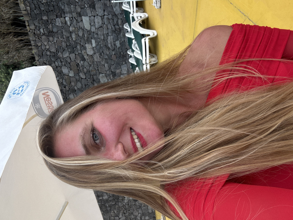 A blonde female subject, smiling with blue eyes and red lipstick, is depicted in a frontal, slightly angled view. Her long, highlighted blonde hair partially obscures the left side of her face. She is wearing a red off-the-shoulder top with ruched detailing on the right shoulder. The outdoor environment, located in São Vicente, Portugal, features a bright yellow ground surface. A partially visible white beach umbrella, displaying an inverted "Nestlé" logo and a "MADE WITH RECYCLED PLASTIC" emblem, is positioned above the subject. In the background to the right, multiple white plastic sun loungers with dark green fabric are visible near a dark, stacked stone wall. Sparse vegetation is present above the wall.