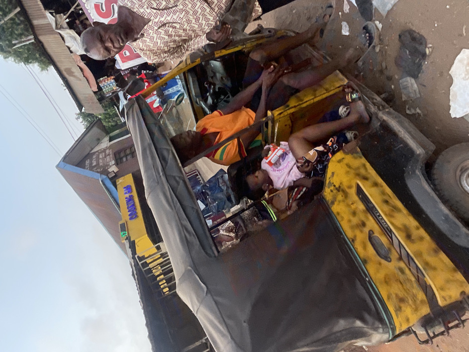 Several people are inside a yellow auto rickshaw. One man in a patterned shirt stands at the top left, and another in an orange shirt is inside. There is a child in a pink shirt, a bag of food, and blue jeans inside the auto rickshaw. The rickshaw is parked on a street in front of a business that sells cooking gas. The image is taken from an angle tilted to the left.