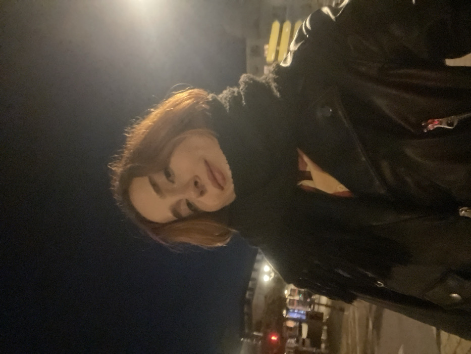 A young woman with reddish-brown hair tilts her head, sticking her tongue out slightly. She wears a dark, possibly leather, jacket and a black scarf or collar. The background is a dark, nighttime scene. There are faint city lights blurred in the distance. The angle is from below, looking up at the woman. The image appears to be taken with a slight upward tilt.