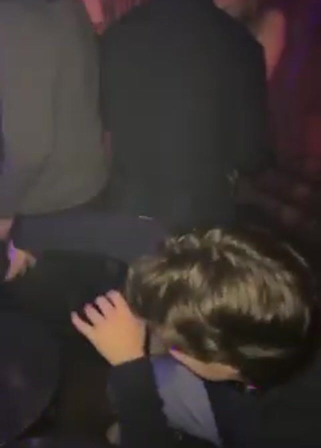 man dancing at a party or club. He is wearing a dark long-sleeved shirt and light blue jeans. He is surrounded by other people and the environment appears dark with colored lighting. The focus is on the man's movements as he dances.