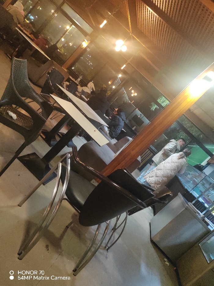 A dimly lit indoor space appears to be a restaurant. There are tables and chairs, some occupied by people. Large windows are visible in the background, reflecting light. A prominent wooden beam runs through the space. The lighting is a mix of natural light from the windows and artificial light. The interior has a casual atmosphere.